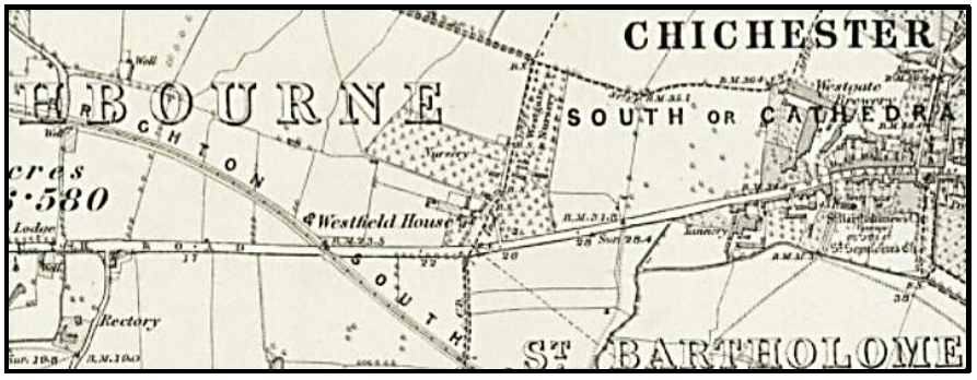 The first proper survey map (by George Loader 1813) shows the house clearly. There are also other points here we can recognise today – the squiggly line to the north of Westfield House is Hook Dyke (now partly in Neville Road), Apuldram Lane and Clay Lane are pretty much the same shape (and in “Fishbourn”) although the railway hasn’t yet been built.