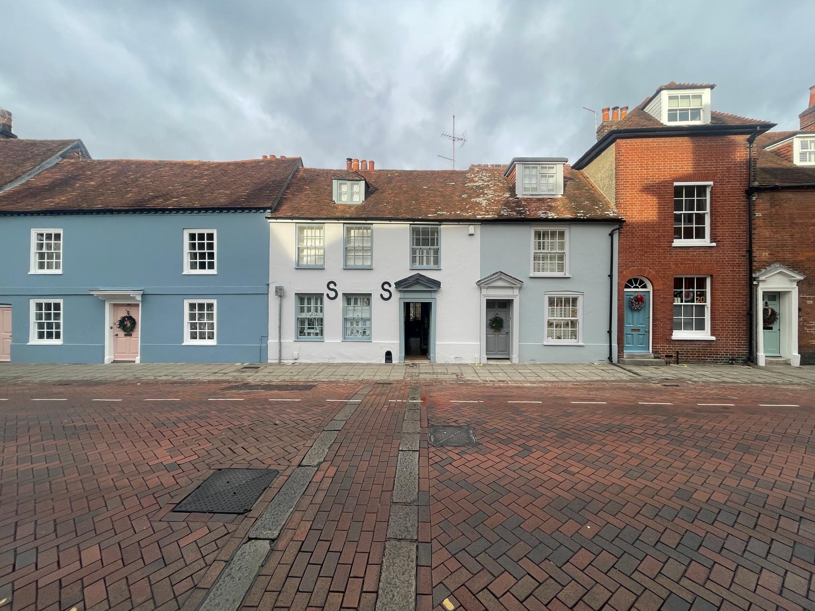 It is a two-storey house with attic and of three bays, with the front door in Bay 3. The brick front has been stuccoed as has its neighbours. It is a double pile beneath a tiled ‘M’ roof whose ridge line is lower than the two abutting buildings. Indeed, the irregular roofline of the whole terrace strongly suggests that the post-1642 rebuilding had taken place in a piecemeal fashion. There is a central chimney stack adorned with some Fareham pots.