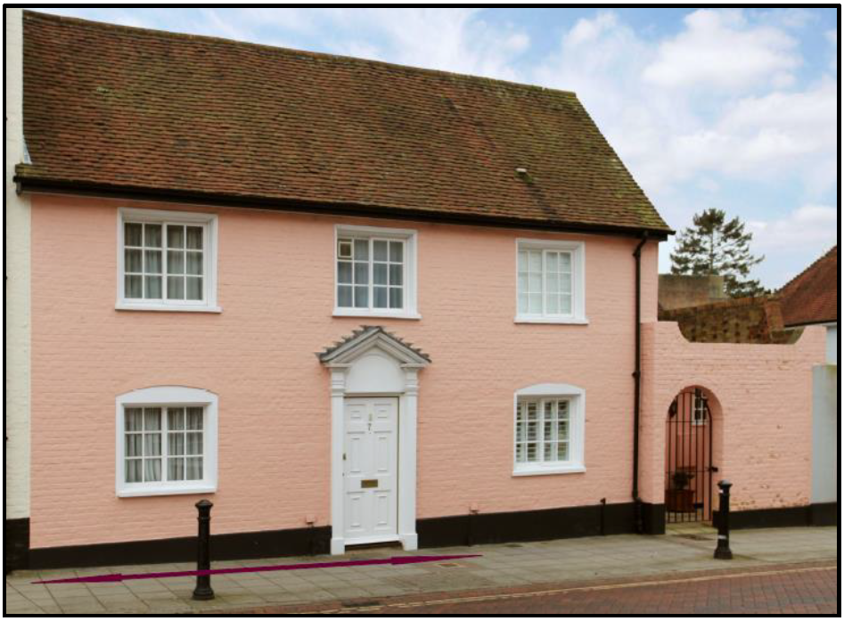 “CHICHESTER Westgate (South Side): 3/312: No 11 (Formerly listed as No 4): 5.7.50.: II: C18. 2 storeys. 3 windows. Immediately adjoining western extension to Marriott House but with much lower frontage; steeply pitched tiled roof. Painted brick. Sliding windows, those on the ground floor having slightly curved headings (formerly, wooden shutters also to ground floor windows). Glazing bars. Doorway with Doric pilasters and pediment. Door with upper part glazed and with 2 fielded panels below; blocked semi-circular fanlight over. Fire insurance company mark. 1 storey extension to west; painted brick; flat arched doorway with wooden boarded door.”