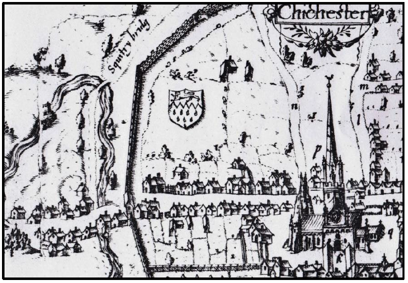 John Norden’s map of 1596 shows houses on the south side of Westgate, between the West Gate and St Sepulchre’s Church – which is in the left bottom corner of the map (WSRO).