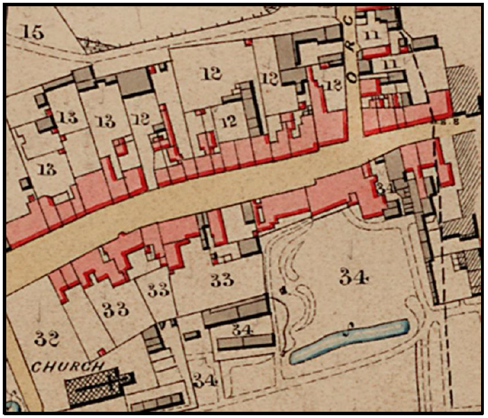 These houses do not match the later footprint of houses on the site of no. 9. In fact there appear to be two similar houses orientated at right angles to the road, just to the east of the path through to the fields that was later incorporated into the property. The houses also have long gardens. Both these factors are an indication that these plots started their lives as medieval burgages. This was an ancient form of urban land rental from a king or a lord, which began in the 13th century when towns were known as burghs or boroughs – hence the name. These plots are known for their narrow strip footprint, with long gardens for growing food and houses which were placed end on to the highway since the narrowness of burgages did not allow for a full street frontage.
