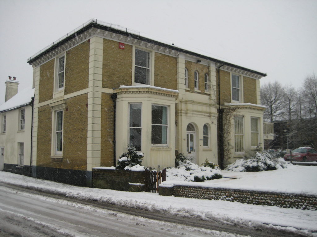 Rare coloured streetview of the Tannery with the Tanner’s House in the foregournd, built in 1910 and later used as an office. Most of the magnificent nursery flint wall to the left is still standing. (Ken Green)