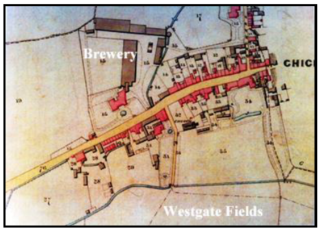 It is also known that there was access to the Deanery Fram down this lane and on the map we can see a bridge over the Lavant for access. Little bridges across the tributaries of the Lavant that ran through the Westgate Fields were still in evidence in the 1940s.