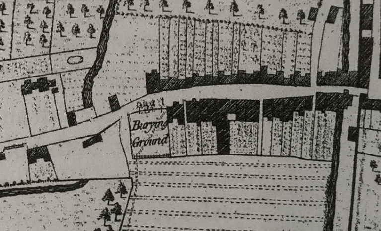 In a legal document of 1726, in the period in between built churches when there was just a “burying ground” on the site, the church reference has been dropped and the lane is referred to as “a little cartway” (see below).
