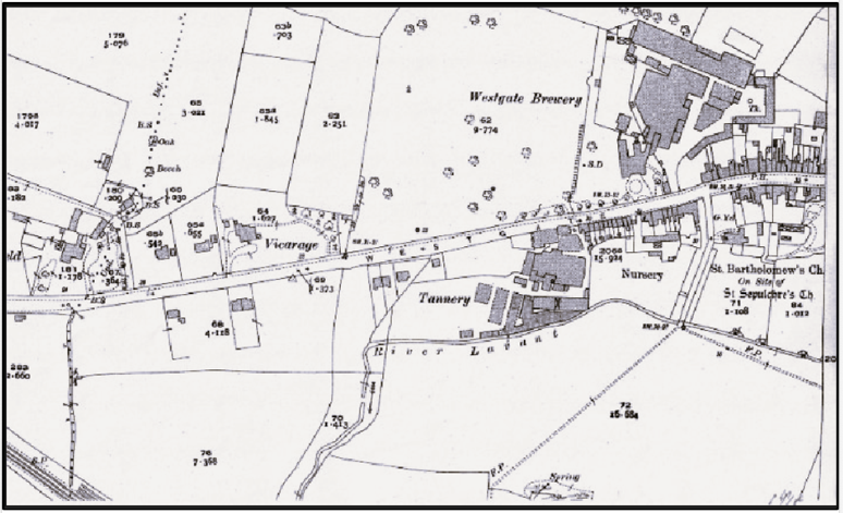 There is then a pair of houses which still exist and the next clear plot is the Tannery, which had been started about 1550. By this point the river has crossed back under Westgate and the vicarage to the south of the road. Maltings had been founded in the Squittery Fields to the north side of the road, presumably opposite the vicarage, and the brewery was set up in the grounds of the big house built in 1751. Seen here to the west of the Lavant River which ran north-south through the property and an essential part early on in the making of the beer.
