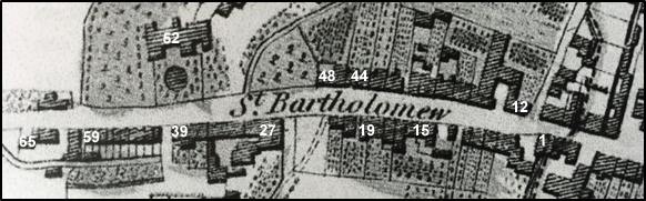 - 37 is the churchyard with the church (St Bartholomew’s) now finally rebuilt