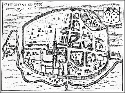 Very similar to the Norden map, the city is here laid out much as today, with the Roman roads and gates to the North, East, South and West. The Cathedral is clearly shown. The Pallants are in the South west, with the home of the Black Friars in the far corner and the remains of the old Norman Castle to the north east, now the home of the White Friars.