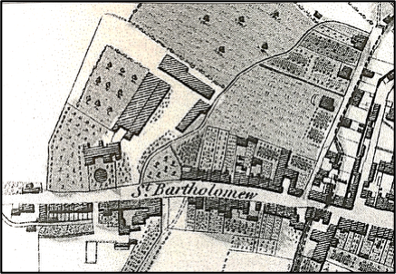 Westgate is already a significant suburb, with many houses each side of the road. The church of St Sepulchre is just at the west edge of the map.