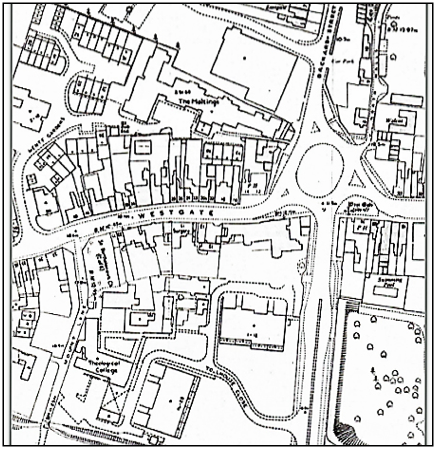 One can see that building work has now begun to spread west beyond the Tannery. The large vicarage on the north side was for St Bartholomew’s Church and is now a set of apartments at no.74. Throughout this period, Westgate continued growing to the West (left), with even a few houses appearing beyond the railway crossing. This is not visible here, but the railway can be seen cutting across the bottom left hand corner of the map.